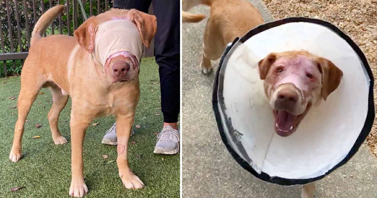 Despite severe facial burns, veterinarians believed Buddy’s eyes were still intact. Over the months that followed, he underwent multiple surgeries, including skin grafts, and remained wrapped in bandages to protect his fragile skin.