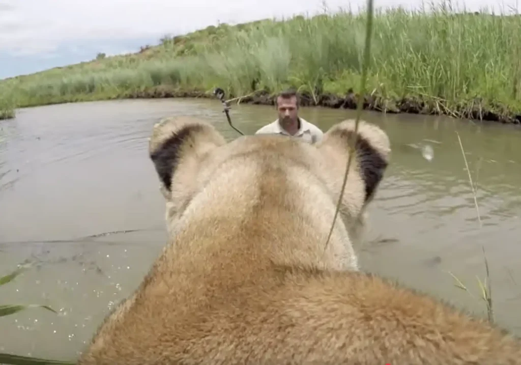 In a moment that stunned viewers, one of the lions spotted Richardson, leapt into the water, and ran straight toward him — not with hostility, but affection. The footage shows the enormous lion embracing him as though no time had passed.