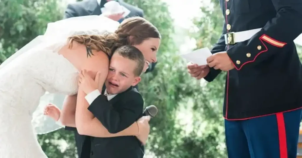 That was all it took. The tough little guy, who had kept it together through the ceremony, suddenly crumbled. With tears streaming down his face, Gage rushed into Leehan’s arms, sobbing as guests watched in stunned silence.