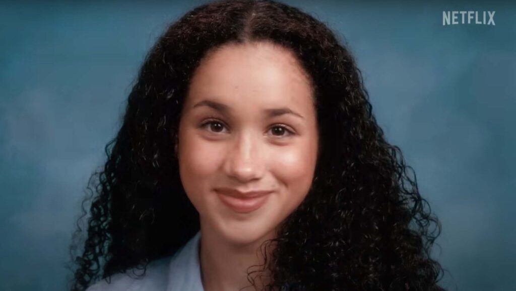 The docuseries includes precious, previously unseen photos of Meghan as a child—hugging her mother Doria Ragland, playing in a yellow sweater, or wearing a school uniform with a big smile. In one photo, a young Meghan wears light makeup, hinting at her early curiosity about identity and presentation. Another shows her in a blue collared shirt with thick, dark curls.